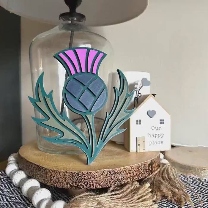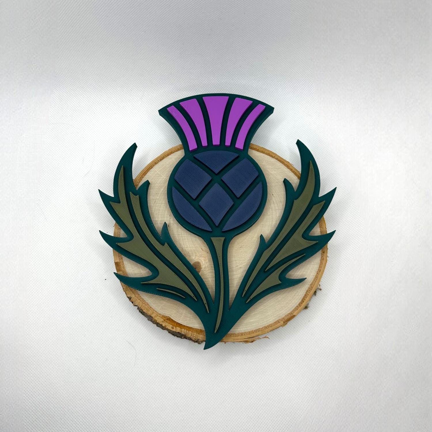 Add a bold touch of Scotland to your space with this striking layered thistle wall art. Featuring rich tones of purple, navy, olive, and deep green, this modern take on the national flower blends Celtic charm with clean, contemporary style.