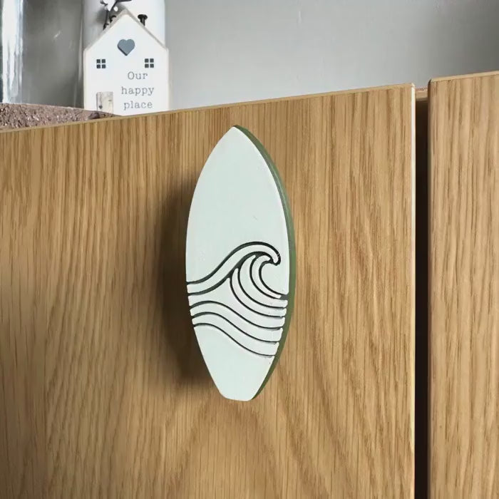 Add a wave of fun to your furniture with this unique surfboard drawer pull. Available in olive green or navy blue, each handle features a pale beige top with a flowing engraved wave, creating a cool coastal look with a playful twist.