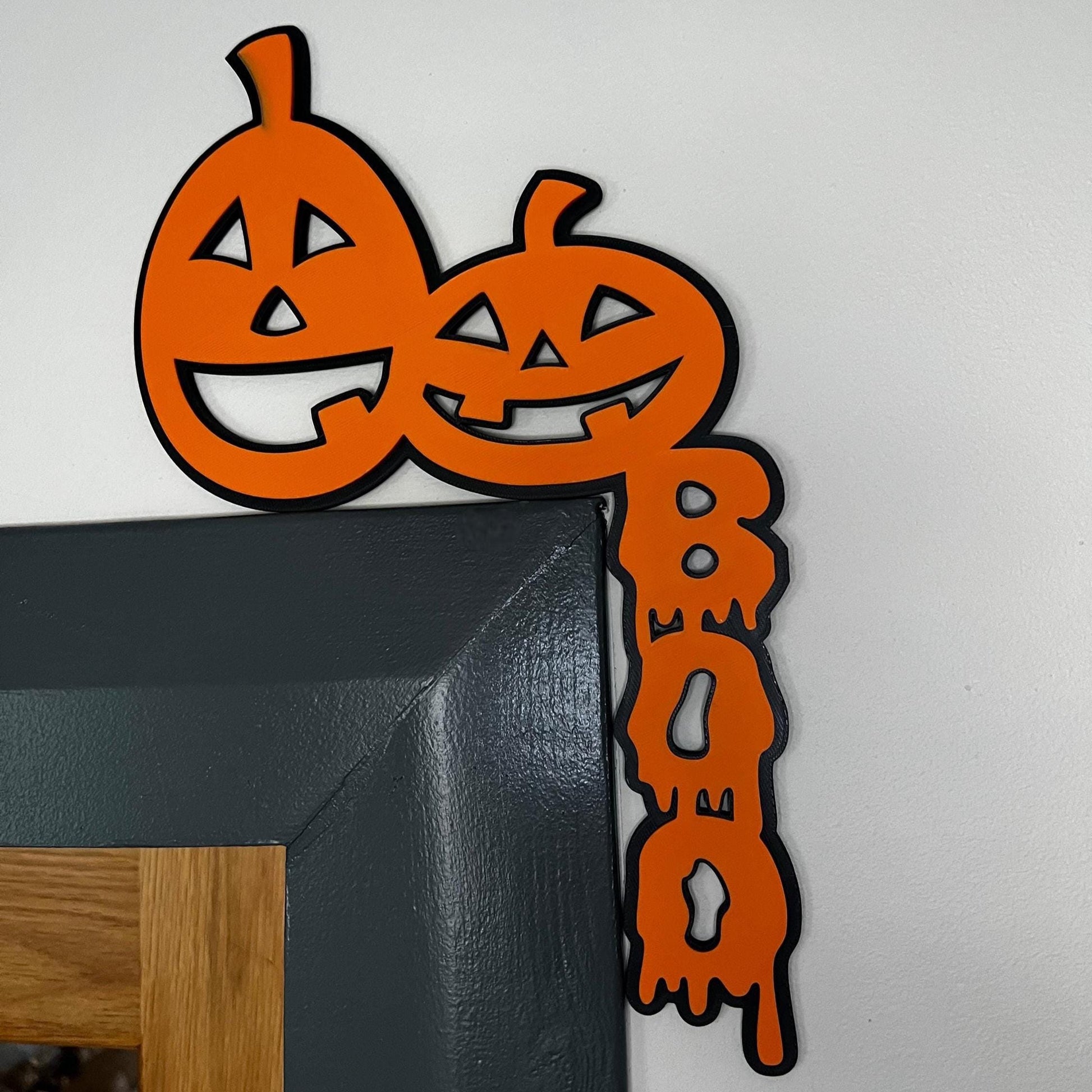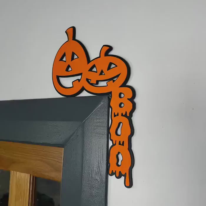 Add a spooky yet playful touch to your home with this Halloween pumpkin corner sign! Designed to perch perfectly on the top corner of any door frame, this eye-catching decoration features two cheerful jack-o'-lanterns and the word "BOO" in dripping orange letters. Made from sturdy material with a bold black outline, it’s the perfect seasonal accent for Halloween parties or simply to get into the spooky spirit. No nails or glue needed – just pop it on the corner and you're ready to haunt!