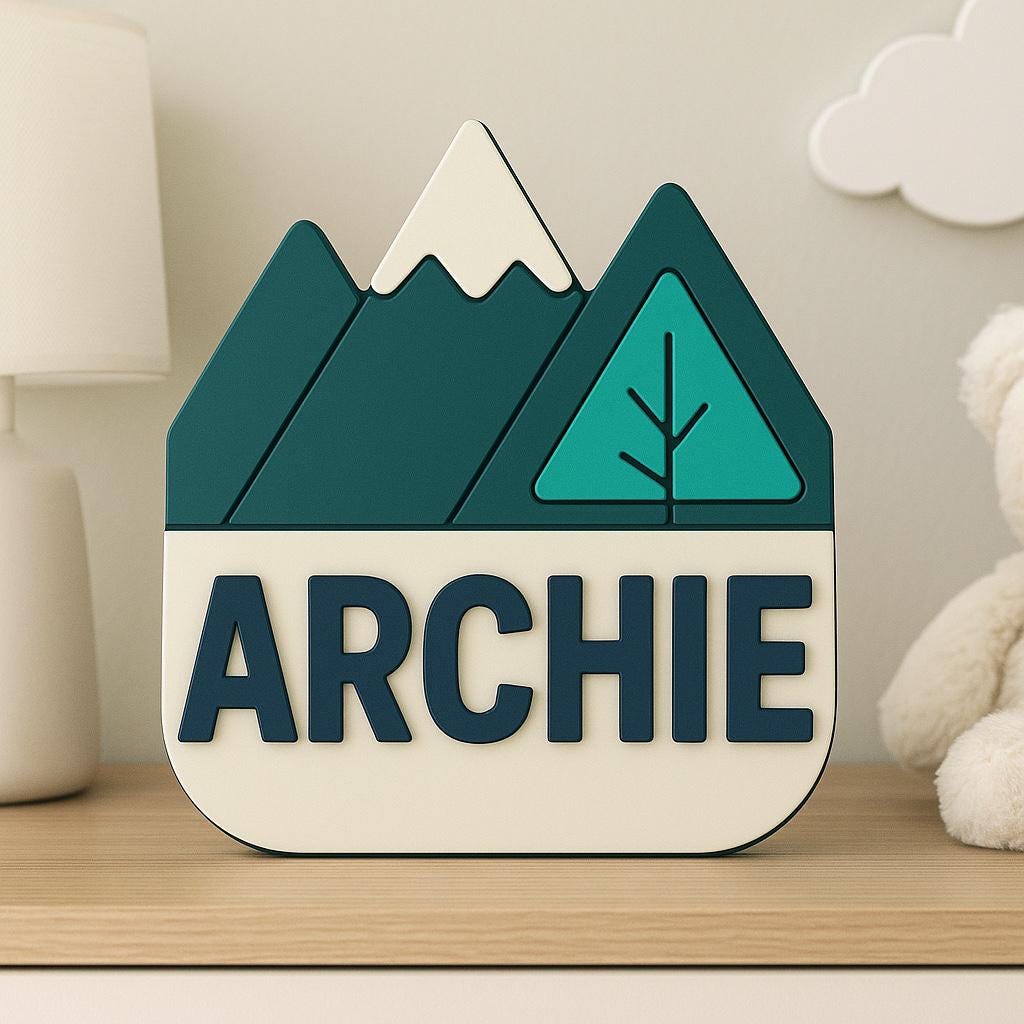 Featuring layered mountains and a stylised tree, it’s the perfect touch for adventure-themed nurseries, woodland bedrooms, or cosy offices. A unique and thoughtful gift for little explorers (or big ones)! 🌲✨