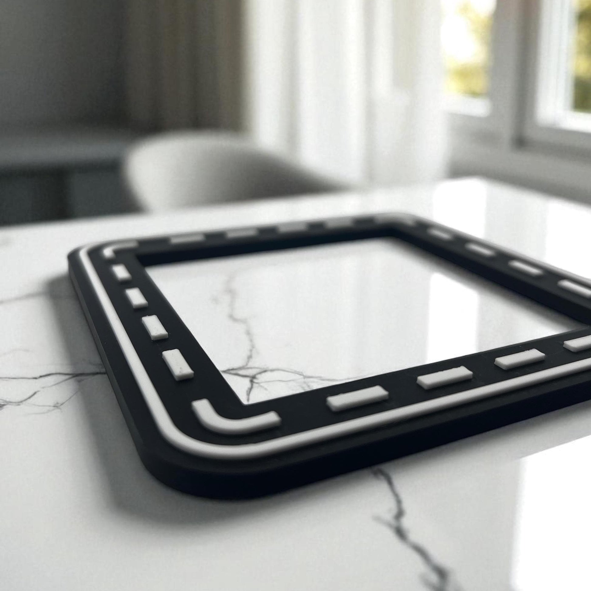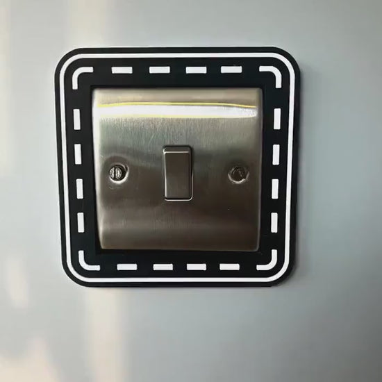 This playful light switch surround features bold, broken white track lines to mimic the look of a real racetrack. It's the perfect finishing touch for a car-themed nursery, toddler’s bedroom, or fun playroom.