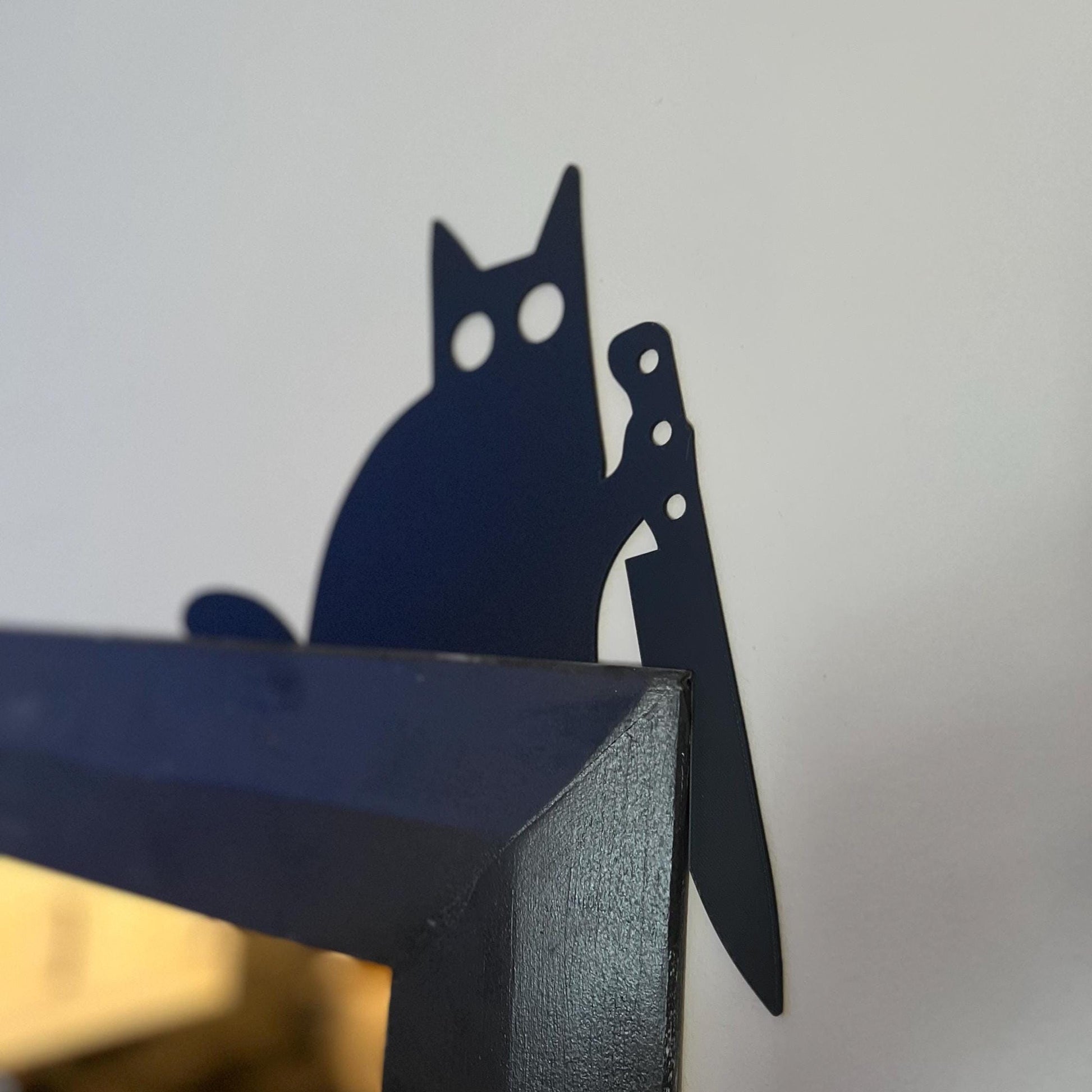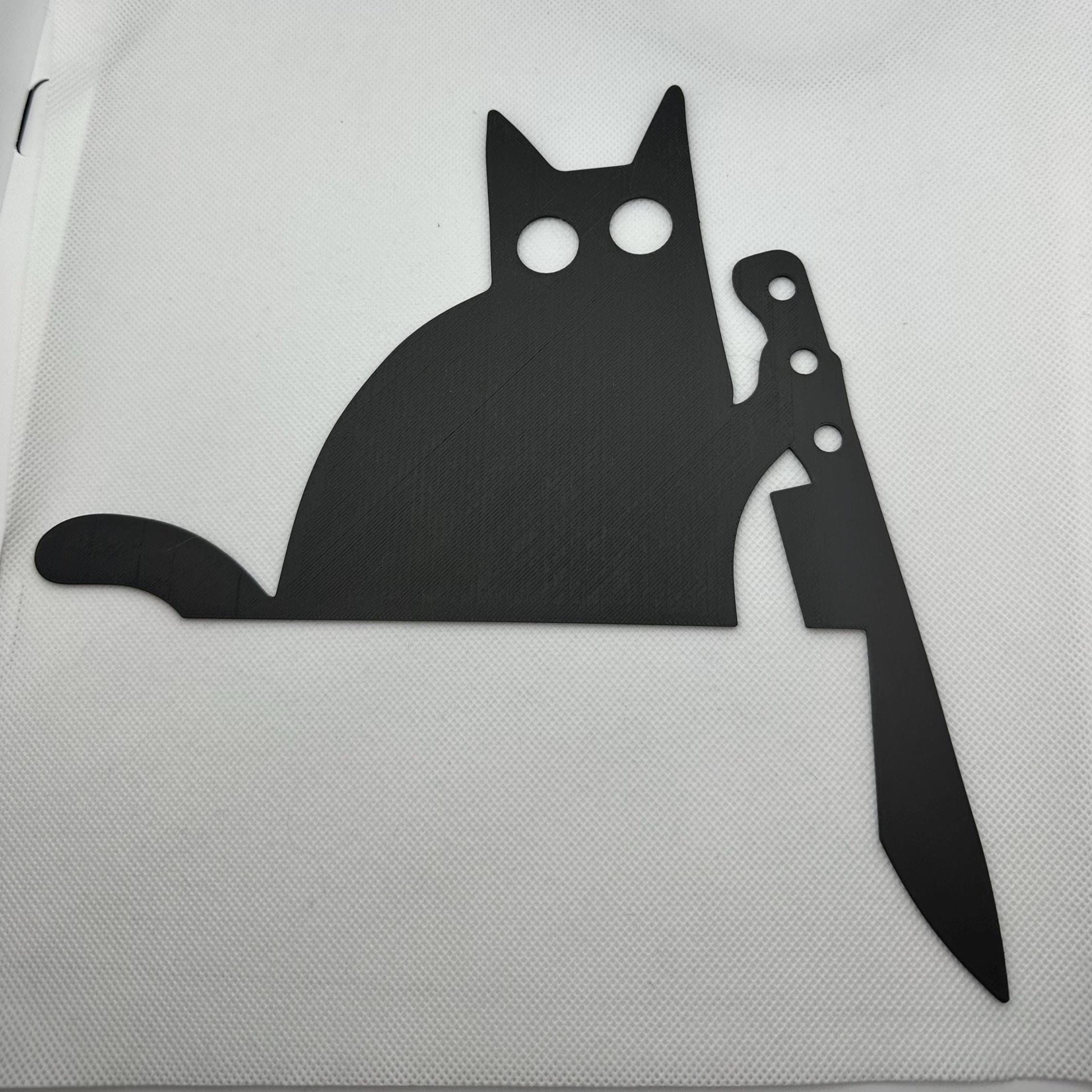 3D printed from eco-friendly PLA, this minimalist feline perches on your door trim—complete with a playful little knife for extra haunted charm 🎃🔪